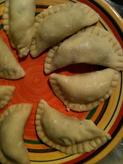 Slightly less work, but more mess than mole sauce, I spent much of Friday afternoon preparing pierogi over at my friend Walker's house. Not only does she have 2 dogs and a cute baby, but her kitchen is about 10 times bigger than mine, so it was a perfect location- and she was kind enough to host me and my 6 cups of flour and 10 lbs of potatoes. The dough recipes seemed straightforward enough, the challenge was in picking the filling. This dish is perfect for an improvisational chef like myself- any combination of mashed potatoes, cheeses, mushrooms and/or vegetables (or bacon, if you're so inclined!) would probably be delicious in pierogi dough. It's also a great dish to make in advance in bulk: together, Walker and I made about 10-12 servings of pierogi, froze them on baking sheets, then put them in a ziplock in the freezer- perfect for last-minute meals!