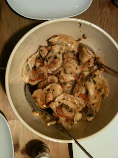 The sauce: Again, get creative. I made a sauce of sauteed mushrooms, onions, tomatoes, garlic and butter, with lots and lots of fresh parsley. The tomato was great because it lent a lot of brightness to the dish, both in terms of color and flavor!