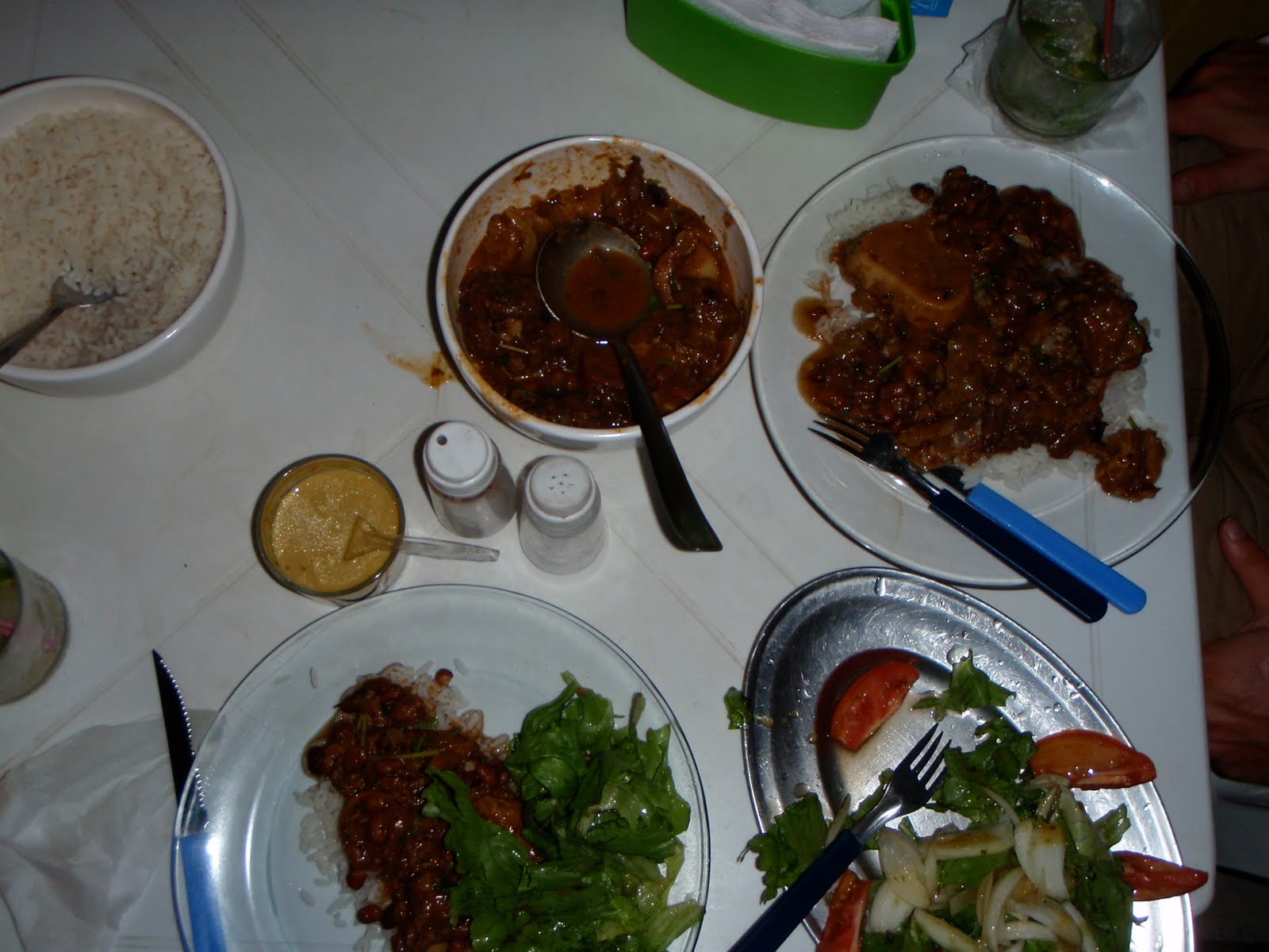 As promised, I tried the Brazilian national dish, feijoada. This dish is a stew made of assorted animals and animal parts, beans, cilantro, and mysterious lumps, served atop rice. Kyle (my traveling buddy) is fluent in Portuguese, and asked the waiter what was in the feijoada. The response was a longish list of animal bits, including tripe. Kyle translated the list back to me, but left the English word for tripe off the list. (Don't worry, I heard it.) I scooped a selection of lumps out of the sauce- beef (I think), pork sausage (I think), but no tripe (which is wobbly and slightly hairy.) The taste was wonderful- spicy and tomatoey and zesty and rich, but a few bites were enough. I would not make this at home, but I did like the homemade hot sauce that came with it and hope to make my homemade hot sauce sometime this week.