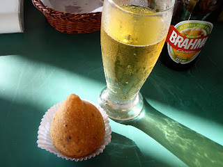 Finally, one other food item I promised to try was a Coxinha. These were everywhere, sold in small shops, bakeries, and some restaurants. Some were the size of a quarter, but most were about the size of a tennis ball. I finally tried one on the last days of the trip. We were in Salvador, and it was a very hot afternoon, so I washed my coxinha down with a cold beer. (The beer was terrible, by the way.) The coxinha was served hot and freshly baked/fried (I'm unsure, it tasted lightly fried.) It was intimidating to tackle: it's bigger than it looks in the picture, and appeared to be a large, teardrop shaped lump of fried yucca flour. But I was committed, so I bit into it. The outermost layer was crisp and flavorful, but the inner layer of the dough was more mushy in texture (it's yucca flour, I guess that's how it tastes?). However, the filling, a mixture of chicken, herbs, and catupirhy cheese (like a strongly flavored cream cheese?) was delicious. It made for a very filling snack. Would I make it at home? No. However, I think this is the sort of product that Trader Joe's should sell in it's frozen appetizer section, and think it would do well sold alongside the spanikopita, cheese and onion tarts, and mini spring rolls. If I were a Brazilian watching the Super Bowl, I'd eat a lot of coxinhas.