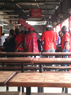 Apparently this is how it works, though, at this particular eatery. Other clientele approached, selected a picnic table, and were immediately surrounded by at least a dozen men and menus. (There is one person sitting at the table in the picture above.) Also, you can't read it in the picture, but the red signs say something along the lines of "you must order your meal directly from the restaurant". Hmmm.
