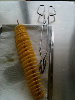 They take a peeled raw potato, then insert it in a little contraption which somehow slices/spirals the potato. Then, the spiraled potato is stretched out on the stick and plunked in a fryer. After a good solid fry, the stick is removed and sprinkled with your choice of flavors. There were the traditional chip seasonings like sour cream and onion (which is what we had) and salt and vinegar, but also some more unusual ones- assorted seafoods, worcester sauce, fruit chutney, chicken...