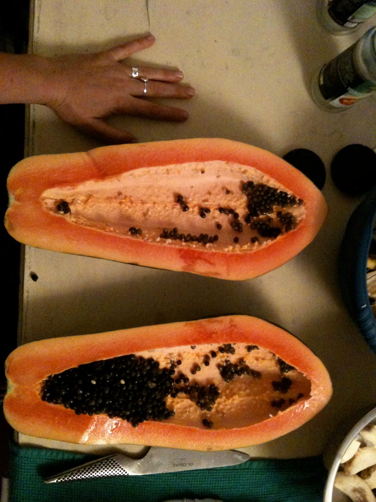 We are still settling into our little house. We FINALLY acquired an oven last week and I've been baking a LOT of muffins. I made some tasty carrot-raisin muffins, but then began to perfect my banana-orange zest-cardamom-pecan muffins. Nathan is enjoying the process. We've found places to buy fruit and discovered that Kenya has gigantic papaya and avocado. See above. Gigantic!