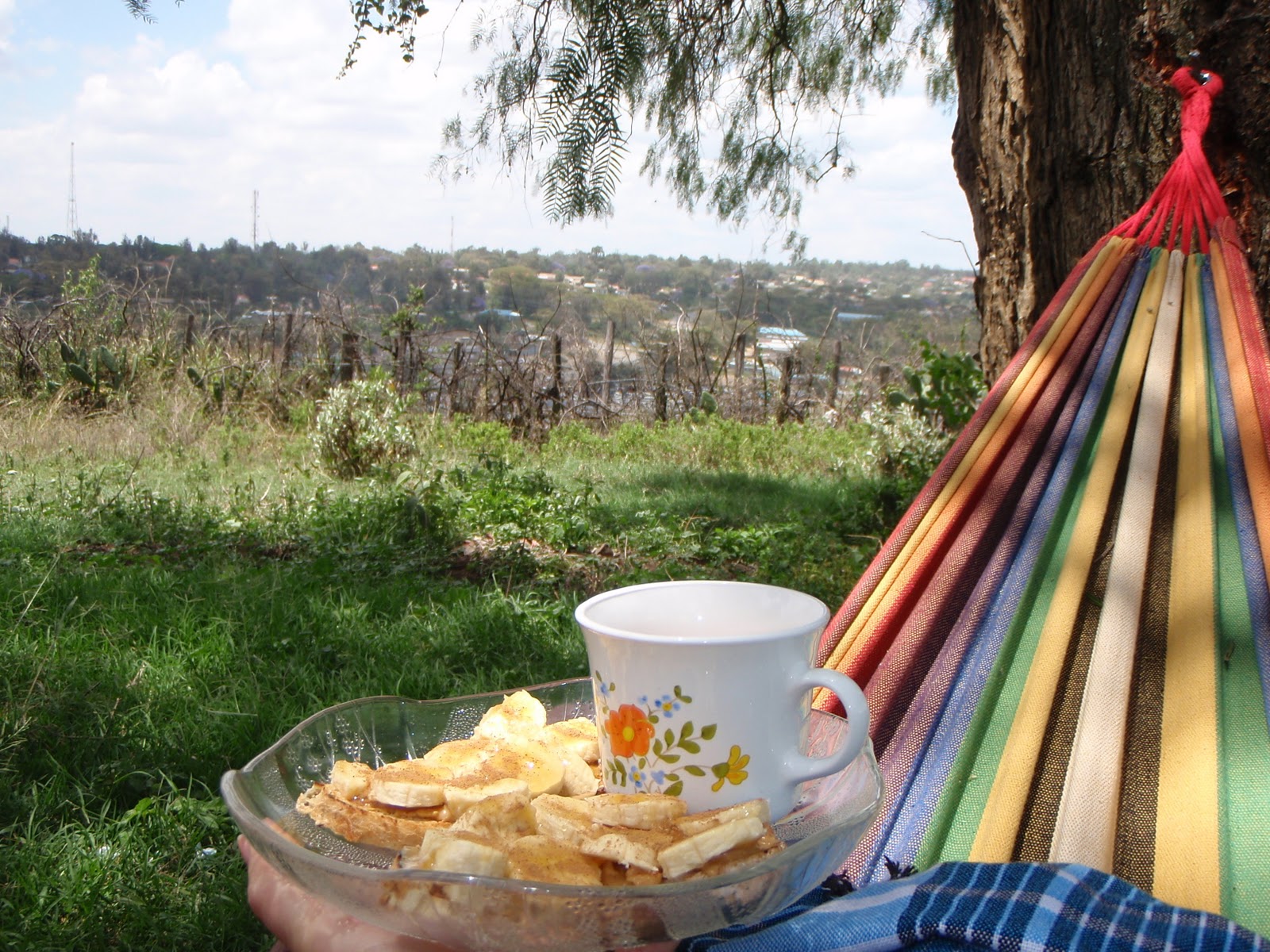 Today started off nicely enough... I had a late breakfast of peanut butter and banana toast and enjoyed it outside on our new hammock. (That's our puppy, Muzungu, in the foreground.)