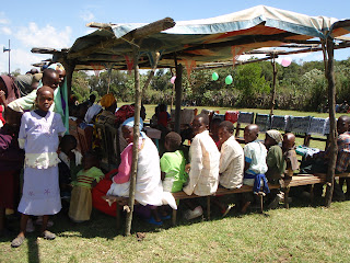 This is when Nathan and I noticed some peculiar things. First, there appeared to be three brides, as there were three ladies in bright white, lacy wedding dresses. We thought at first that this might be a polygamous wedding and our interest piqued. After some questioning of nearby guests, it turned out that only one of the ladies dressed as a bride was actually a bride, and the other two were akin to special bridesmaids. We thought this was a genius re-use of wedding dresses. The other thing we noticed, and have yet to fully understand, was the occasional plumes of shaving cream that one particular member of the bridal shower occasionally shot into the air, or vaguely aimed at the bride. (See the picture above for an action shot of the shaving cream.) In fact, during the wedding ceremony at random yet seemingly deliberate intervals, the same lady approached the bride and groom from behind and doused them with more shaving cream. No one seemed to bat an eye. We've since asked a smattering of Kenyan friends about this and all say that it's a normal part of the wedding and that the foam smells like perfume.