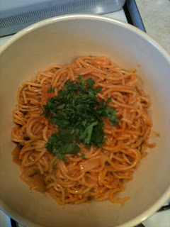 1 lb spaghetti (normally we use whole wheat noodles, but I used regular noodles for authenticity's sake.)