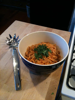 I can tell that this dish is an acquired taste. I actually LOVED the presence of the cloves- it gave the sauce/noodles a spicy depth and I'd definitely cook with clove in savory/tomato-based dishes again. I've also never made spaghetti like this (cooked in it's own saucy water) and thought the texture was delicious. Between the clove and the flavor and texture of the noodles, I didn't think parmesan cheese was necessary- and usually I mound heaps of cheese on my noodles! I've also been discovering a passion for parsley, surprisingly, since it's usually used as a bland garnish at restaurants. I've been enjoying integrating it into dishes.