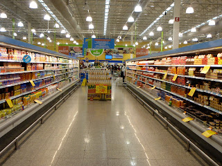 To begin-if you think the picture above looks like any old grocery store aisle, you're wrong. This photo was taken in one of the biggest grocery stores I've ever been in (some employees wore roller skates to get around faster), and this aisle, both sides, was the yogurt drinks aisle. Not yogurt tubs, squeezables, drinks, and single serve cups, just drinks. It was mind boggling. (I dislike yogurt so I didn't buy any, but was astounded at the selection so I had to snap a picture.)