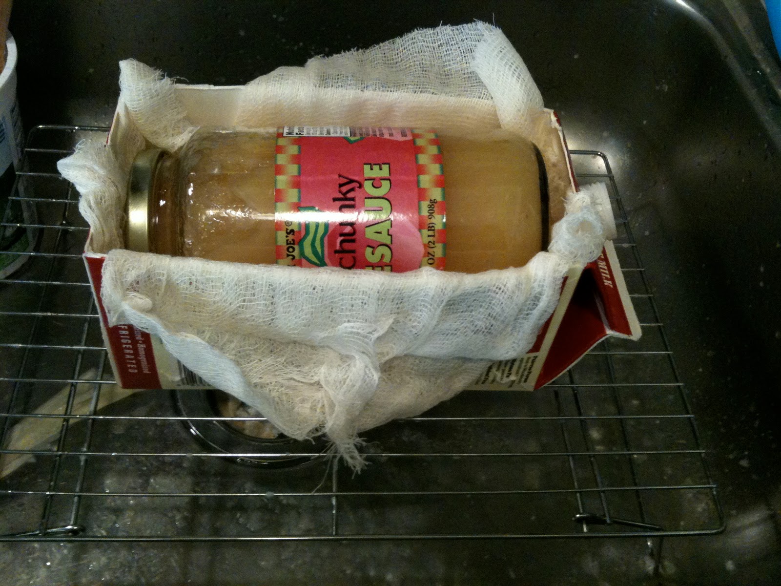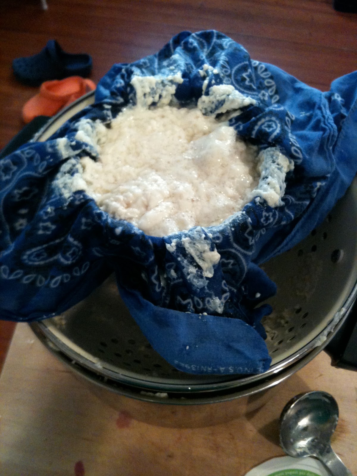 7. While the tofu is coagulating, create some sort of tofu mold. I attempted something with a milk carton that failed, then used a handkerchief, that also failed.