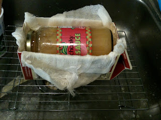8. Pour the tofu mixture into a cheesecloth lined mold. Apply pressure to help the whey drain off. After about 30 minutes with solid pressure, you'll have made tofu. In theory.