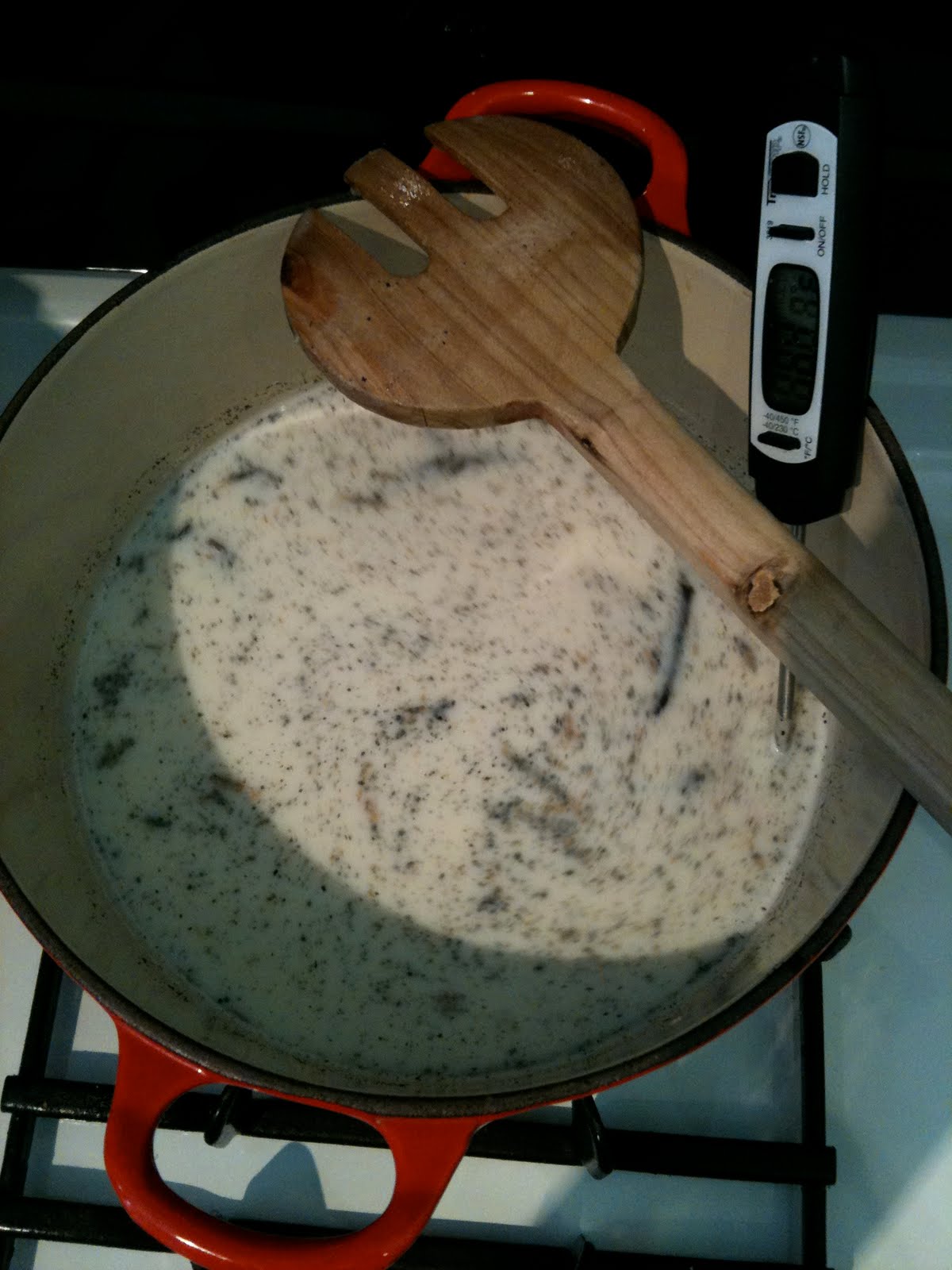 Remove the seeds from the vanilla bean, then add the pod and seeds to a pot with 2 cups of whole milk. Heat to 170 F. (Stir frequently to avoid scorching the bottom of the pot.) Remove the pot from heat, and let the vanilla beans steep for 30 minutes, then remove the pods. (Smell. Isn't that incredible?)