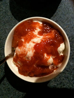 Jen made an amazing rhubarb-strawberry compote that we put on top of the gelato and the flavors were perfect, though this gelato was so delectable that it would have been delicious without. It was pretty amazing- very rich, creamy, and strongly-vanilla flavored.