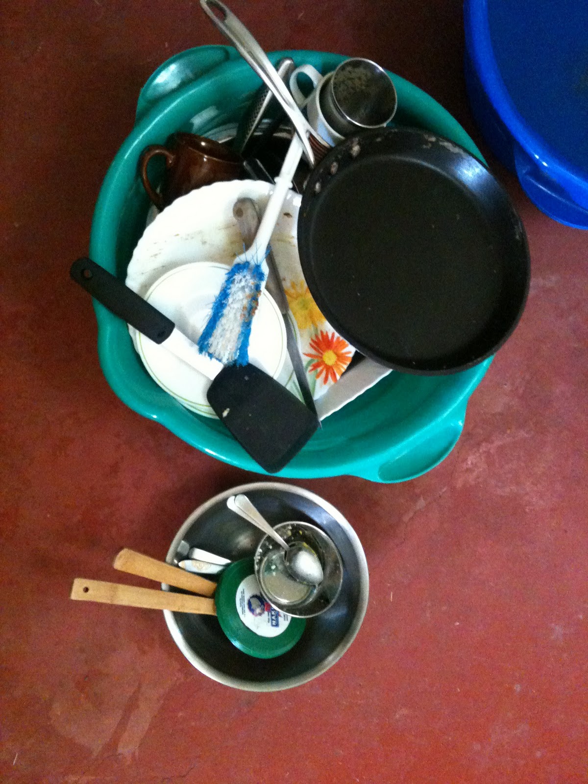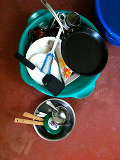 I totally failed. I made a pretty great breakfast and completely forgot about the photos. We had guests, though, and I made about 6 different dishes, so I do have a good excuse, right? Will you accept pictures of the dirty dishes that Nathan was kind enough to do after breakfast?