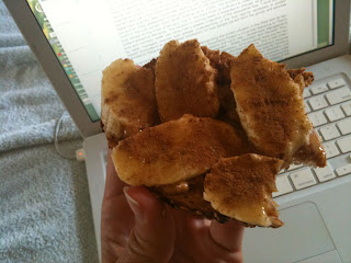 This was my lunch: Two slices of Art Caffe bread (whole grain) with sliced banana, cinnamon, and honey.