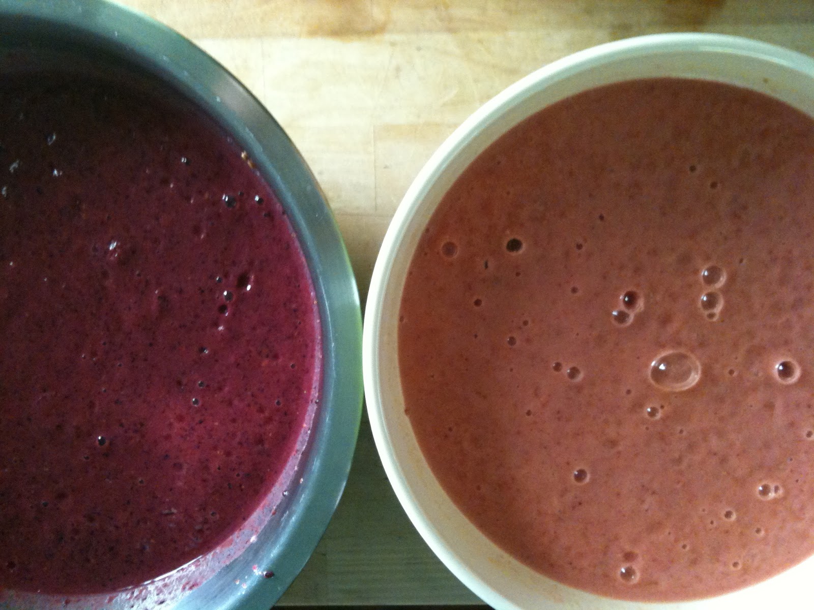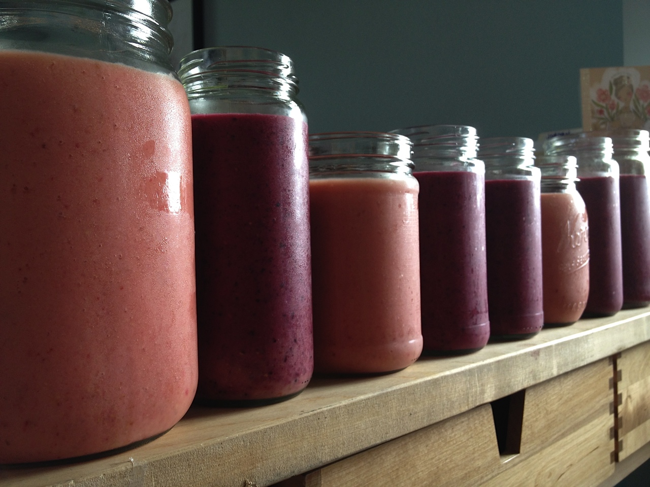 Every few weeks, I dump a couple bags of strawberries, mangoes, blueberries and/or mixed berries in a bowl, add a few scoops of yogurt (the only way I can tolerate the stuff) and some hefty pours of juice. Maybe a big scoop of flaxseeds if I'm feeling fancy. Give it a solid whir with the immersion blender, and I've got smoothies for a week! I pour the smoothie in jars, put them in the freezer, and every night I put a jar in the fridge to defrost. So easy!
