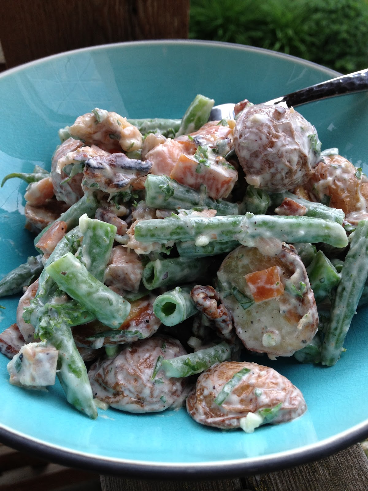 Put the green beans, roasted potatoes (best if they're room temperature), salmon, walnuts, green/red onion and bacon in a bowl, then add the dressing and gently stir to combine.