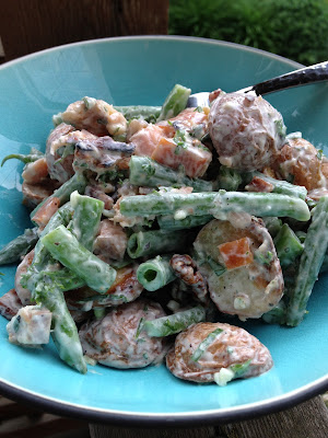 It blew Luke's mind, too. As you know, my dear adorable son is sadly not a foodie. This crushes me. Every time I fix a savory stir fry, a fruity pancake, or a tasty soup and he flings most of it on the floor, I'm crushed. But this salad? Luke ATE this salad. He ate bits of smoked salmon, bites of roasted potato, the (accidental) odd piece of green bean and even some crumbles of bacon. Not only when we ate it the first night, with Freddie and John, but two nights later when I was so fixated on the deliciousness of the salad that I had to make it again- a huge bowl of it that Nathan and I nearly polished off in one sitting.