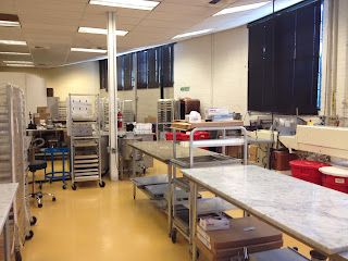 | The kitchen at Theo Chocolate. I'd LOVE to explore in here! The marble slabs on the right keep the chocolate cool as they're creating confections with it. |