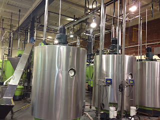 | These gigantic vats are full of chocolate. They're huge- maybe 9 feet tall? |