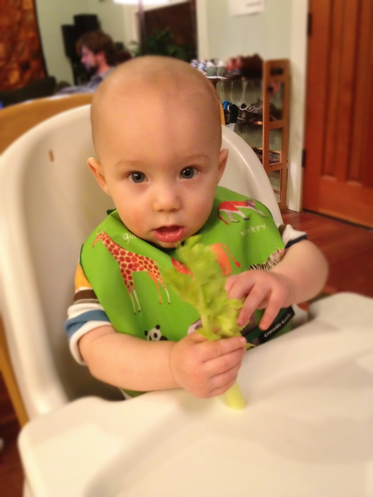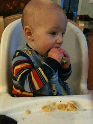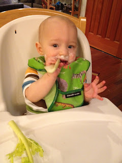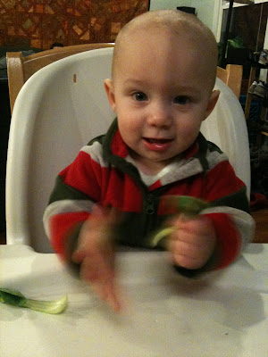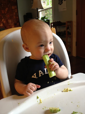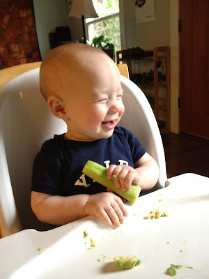 Luke has tasted, if not masticated and/or squashed all of the vegetables here. He isn't really getting the hang of actually consuming them quite yet. Favorites seem to be the cruciferous vegetables- there must be something about the flavor, but he likes gnawing on broccoli, cabbage, and kale. He also loved roasted red pepper, though I can't say the same for the fresh red pepper we gave him this week.