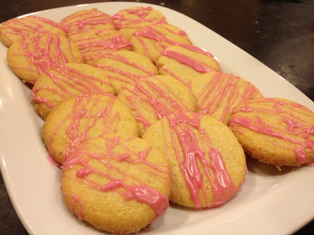 The original recipe had them decorated with glazed hearts, but I didn't have it in me to painstakingly paint hearts on each cookie, so I went for a graffiti-glaze effect instead, which I think turned out great! I also made my own food coloring which sounds crazy but was really simple. I had fresh beets, so I sliced one small one up (it was about the size of an egg), and boiled it for about 30 minutes. Then, I used my immersion blender to almost puree it, and then reduced the liquid by boiling it for another 10 minutes or so. Finally, I poured the beet puree into a paper coffee filter, which drained into a small glass jar. I added about 1/2 tsp. of vinegar, and that was it!